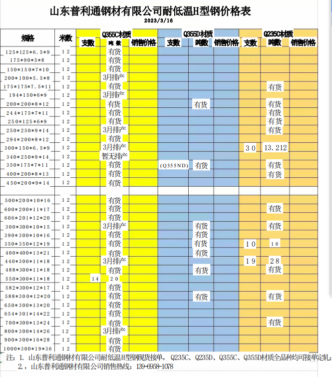 3月16日Q355DH型鋼現(xiàn)貨表
